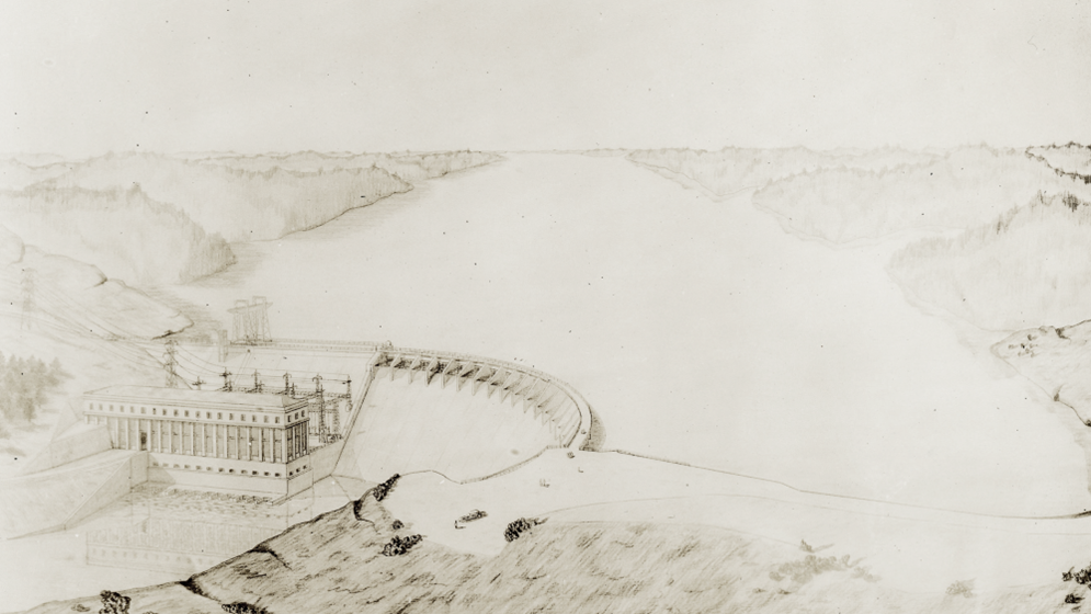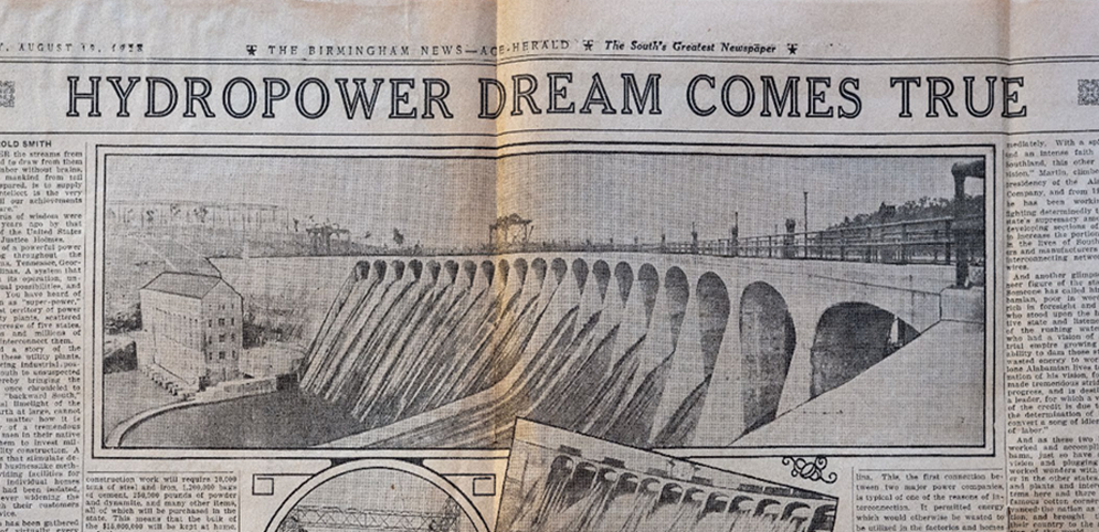 After a decade of challenges acquiring the rights to build the dam, in 1922 Alabama Power, under Thomas Martin’s leadership, was issued preliminary permits by The Federal Power Commission to develop the Tallapoosa River. The license for Cherokee Bluffs was granted on June 9, 1923 and construction began on July 24, 1923. The plant proposed would generate more horsepower than Alabama Power’s two previous projects, Mitchell Dam and Lay Dam, and construction would cost as much as ten million dollars. It was also made known to the public that the dam would flood some 40,000 acres, an area over 3 times the size of Mitchell Lake and the Lay Dam reservoir combined, and create the largest body of water in the state.