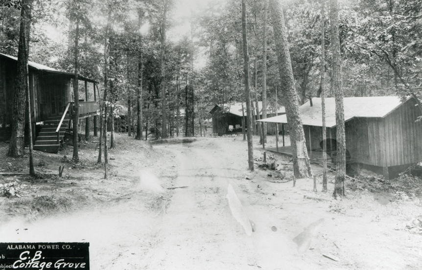 Construction began by developing a village for the construction workers. The village, known as the “city of Cherokee Bluffs” contained 332 structures and a population of approximately 3,000, making it the largest city in the Tallapoosa Valley. After the construction of the dam was finished, the village was converted for use by the Alabama Power workers who operated the dam. The remoteness of the site required a larger commissary, more organized leisure activities, and more entertainment for the workers. The village contained various housing, an amusement hall, a two room school, a church, pool hall, two mess halls, bakery and ice plant, barber shop, shoe shop, and a garage. The streets and buildings were of course, lit by electricity.